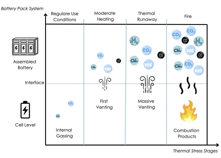 Before a battery reaches runaway temperatures, it begins to emit a unique mix of gases: CO₂, H₂, CO, C₂H₄, and hydrocarbons compounds. These emissions start early, sometimes at just 90–150 °C, offering a vital opportunity for early detection.